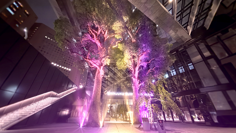 ‐恋弁天のヒカリ‐この地域はかつて湖沼・浄水場で水に縁があることから、弁天様をモチーフとした作品「恋弁天」は作られました。新宿住友ビル創業時から「恋弁天」とともにこの地を見守る2本の楠をライトアップ。