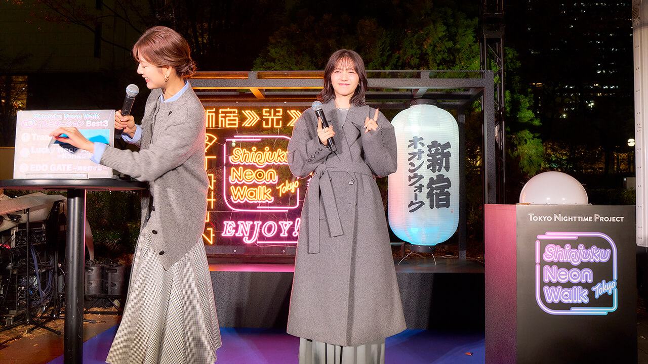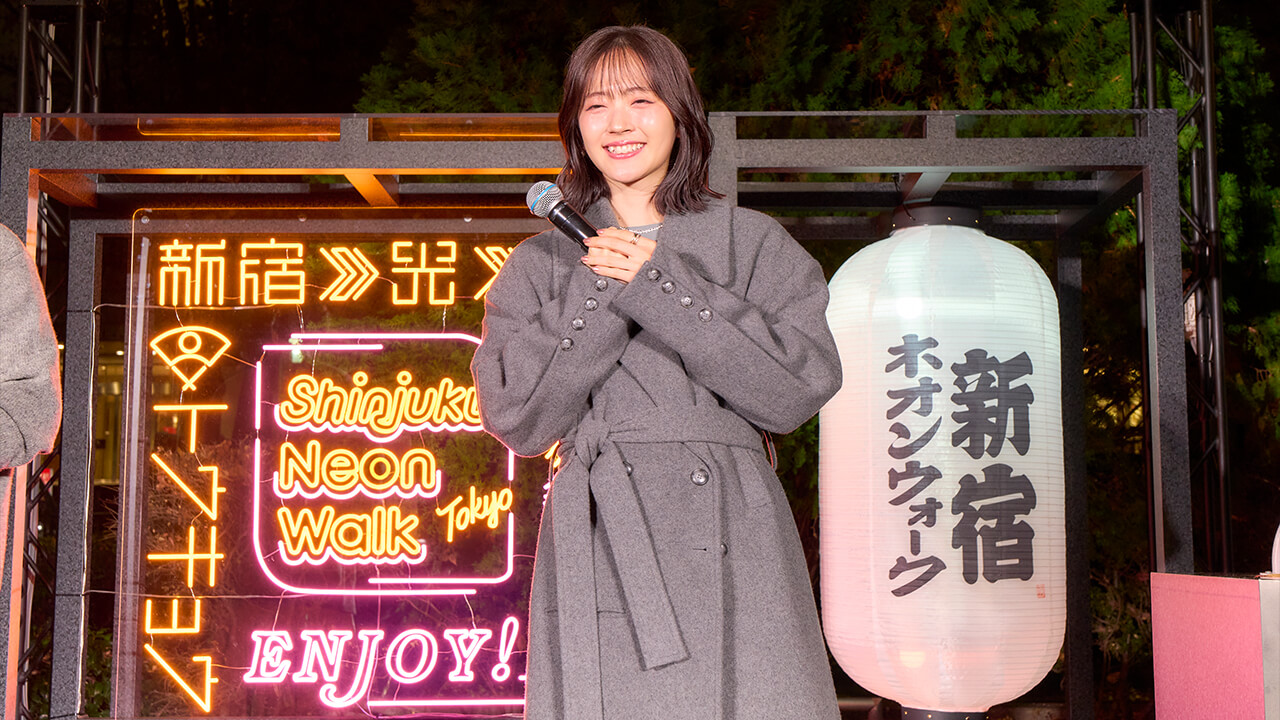 続いて、イルミネーションの点灯セレモニーへと舞台が転換し、点灯ボタンが運び込まれると、鈴木さんはどこかソワソワした様子に。MCのカウントダウンに合わせてボタンを押すと、『Shinjuku Neon Walk』のイルミネーションが一斉に点灯し、西新宿の夜が一気に華やかな光に包まれました。